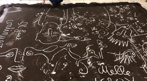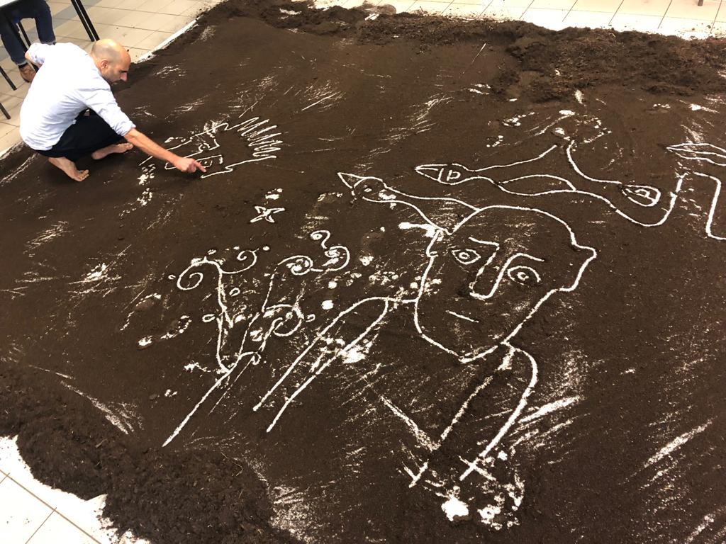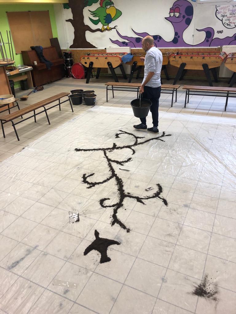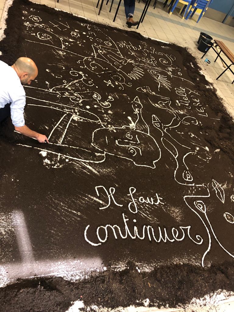 Au gré de son récit, Hervé modèle un oiseau, un arbre, détruit ses esquisses, tamise la matière, trace des mots, et enfin élabore une grande fresque sous les yeux des élèves.