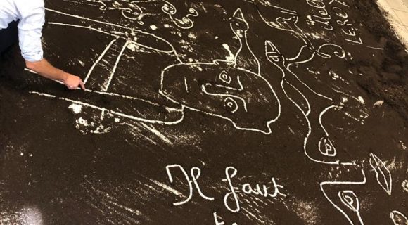 Ces contraintes nous ont conduits, avec la scénographe Camille Riquier, à penser une forme où nous dirigerions le regard des spectateurs vers le sol, un sol dont nous pourrions maîtriser l’esthétique. Un dispositif en quadri frontal, une bâche et un peu de terreau nous ont permis de résoudre cette équation. Ce dispositif fait surgir la force symbolique de la terre, raconte le rapport privilégié du narrateur à la nature et permet aux talents de dessinateur d’Hervé de se développer en direct.